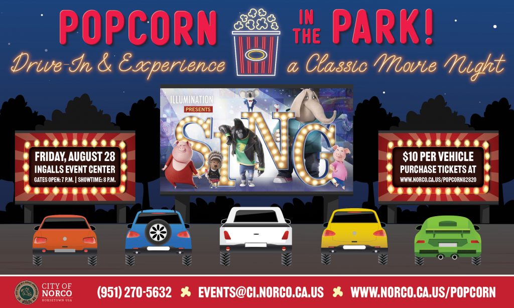 Who’s ready for a night out?! On Friday, August 28, the City of Norco invites you to Popcorn in the Park featuring the animated, family-fun, musical comedy “Sing”! Drive-in and experience a classic (and socially distanced) outdoor movie night from the comfort and safety of your own vehicle! Every car will receive a bag of popcorn and a complimentary Horsetown USA souvenir! Tickets are on sale for $10 and are valid for one vehicle. There are a limited number of tickets available, so purchase yours online today at www.norco.ca.us/Popcorn82820!